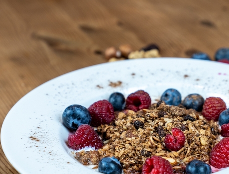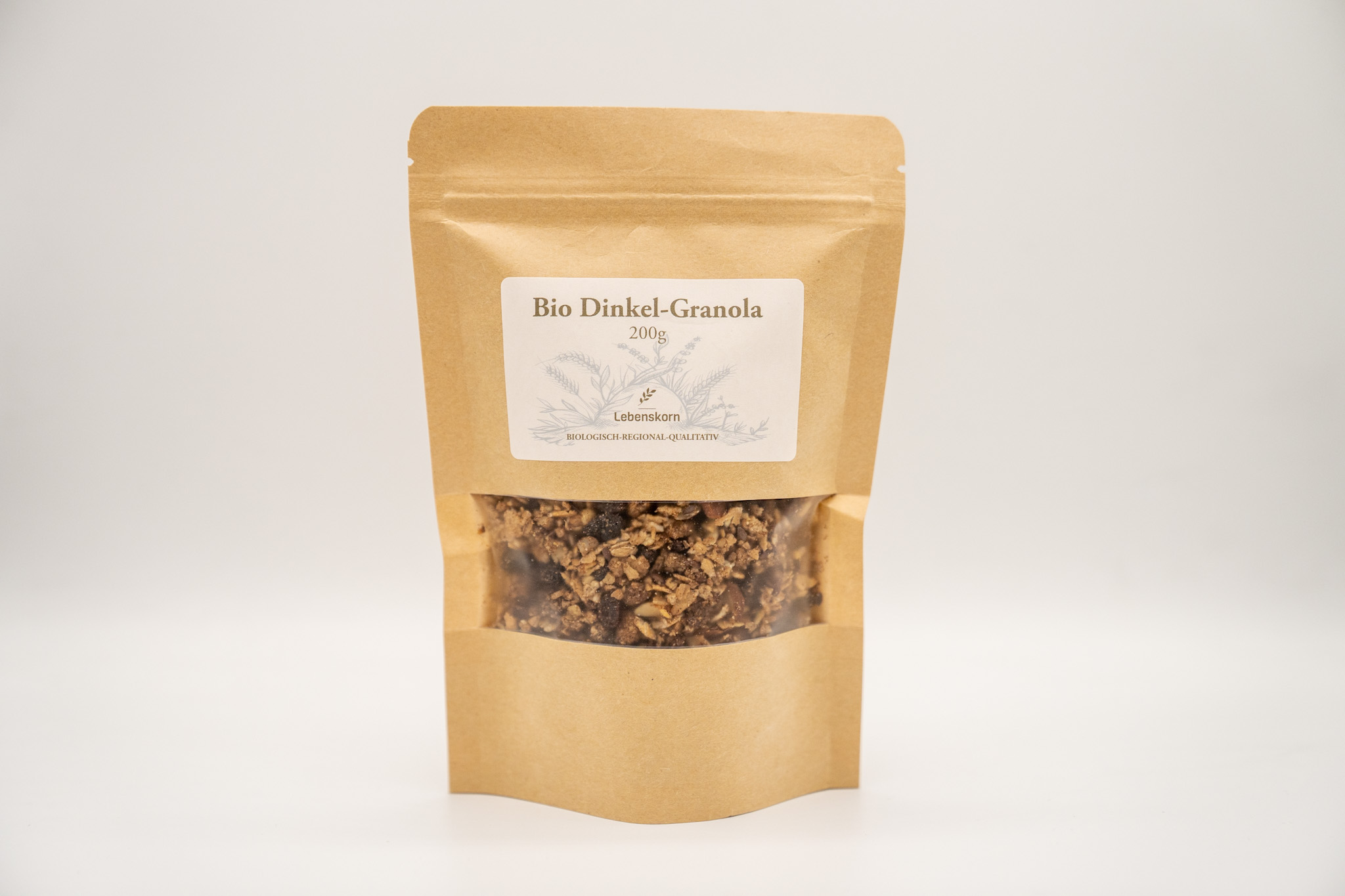 Knuspermüsli mit Bio Dinkelflocken, verdauungsfördernden Leinsamen und vitaminreichen Nüssen aus der Region, verfeinert mit saftigen Rosinen, Blütenhonig und Zimt.